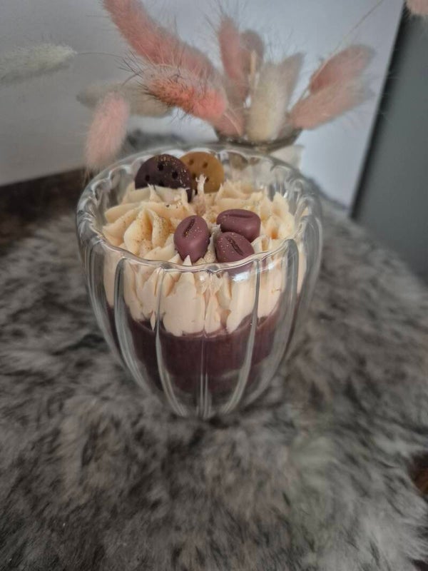 Materiaal kaars: Sojawas (vegan & milieuvriendelijk) Kleur was: Bruin met wit Geur: Koffie Decoratie: Handgemaakte cookie-toppings/koffiebonen van was + subtiele glitter Aantal lonten: 1 Brandduur: ± 25-30 uur Afmetingen mok: ± 8 cm hoog