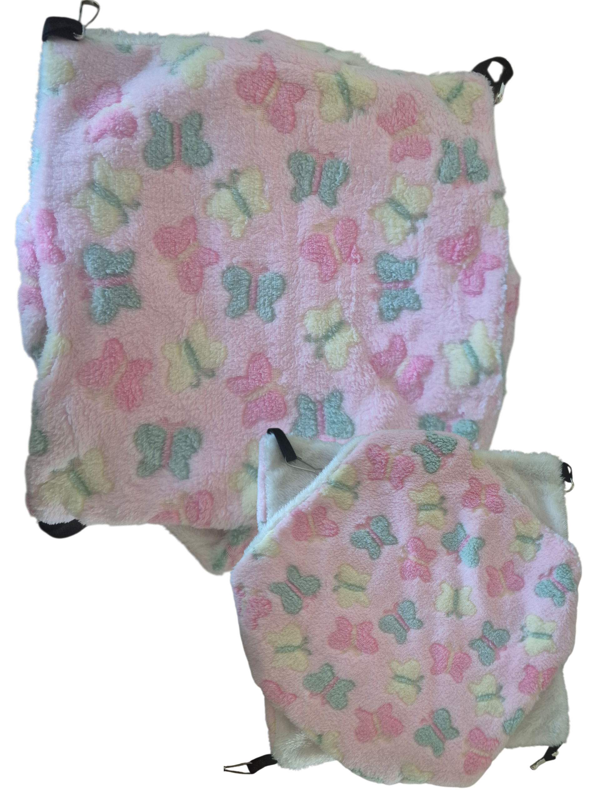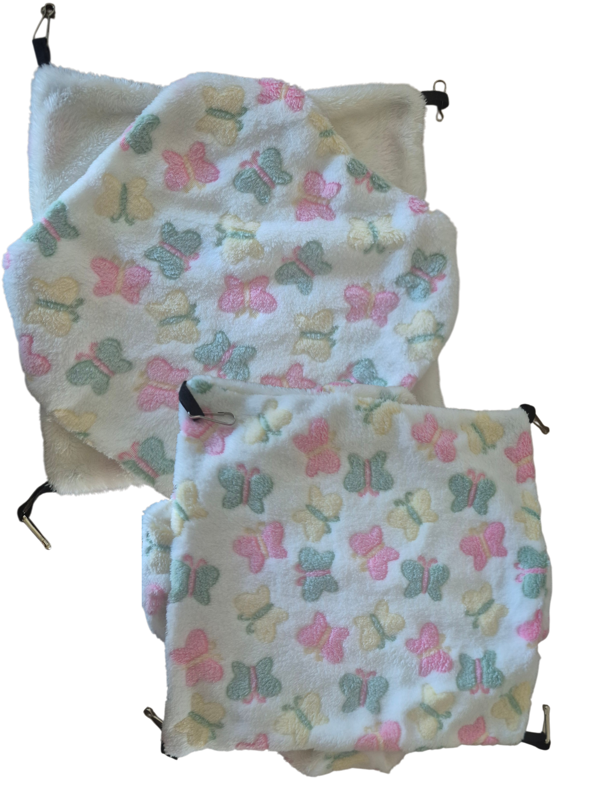 De hangmatten zijn gemaakt van zacht fleece materiaal en hebben een vrolijke vlinderprint in roze, groen of geel. Met een formaat van 34 x 34 cm passen ze in vrijwel elke kooi en vormen ze een ideale kooi accessoire voor knaagdieren.